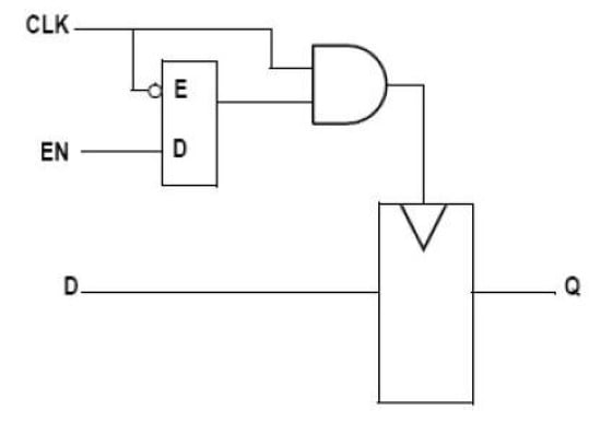 The schematic shown in Figure 4 describes the local explicit clock gating (LECG) technique [,,]. The output Q is updated on the rising edge of the CLK, but only when the ENABLE is high. Depending on the clock insertion technique, there are two implementation methods for the LECG technique. In most cases, the physical clock insertion software will limit the choice of gates that can be used for the logic implementation. For example, a special clock gate may be needed or the tool may require insertion of a gate with the correct drive strength. In this case, the RTL design must be modified to instantiate the required gates. In some cases, it may be possible to simply write the required functionality in RTL and allow the synthesizer to select the needed gates.