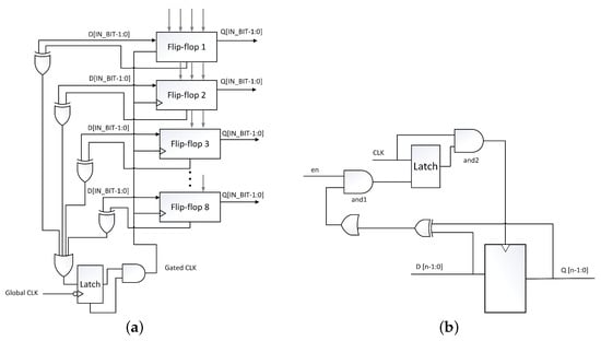 Figure 3 shows two types of registers with and without an enable signal. Furthermore, Figure 3b represents a local explicit clock enable (LECE) [,,]. The output Q is updated on the rising edge of the clock only when the ENABLE signal is high. Typically, logic synthesis will implement the circuit shown in Figure 3b with a 2:1 multiplexer or a multiplexed D flip-flop if there is one available in the target technology. If the enable signal is low for a significant amount of the circuit operation and if input D and output Q are multi-bit buses, then a substantial amount of power dissipated by the clock driver is wasted. That is, driving the clock to this register when the ENABLE signal is low does not change the circuit behavior. An alternative method to implement this circuit is applying the gate on the clock (CLK). Replacing the clock input to the flip-flop with an AND gate where the inputs are the CLK and the ENABLE is not a recommended method to reduce power consumption. Considering the situation when the CLK is high and transitions occur on the ENABLEs, edges will appear on the register clock input, causing incorrect circuit behaviors. To avoid these edges, a latch must also be inserted so that when the CLK is high, no activity on the ENABLE will be transferred to the clock input. Figure 4 illustrates the additionally required circuitry.