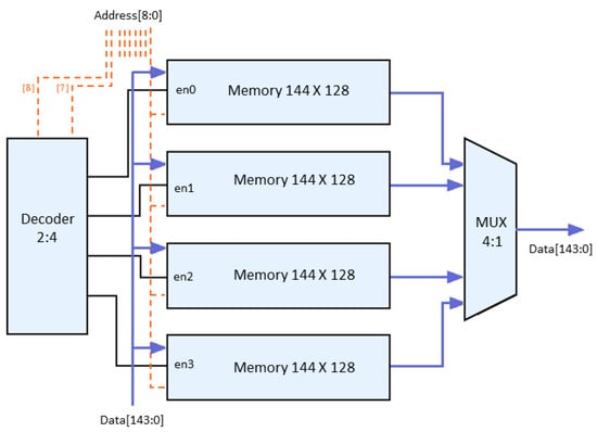 This technique reduces power by dividing an entire memory into several smaller memories using an output multiplexer []. As an example, the following Figure 6’s circuit diagram shows how power reduction can be achieved by splitting the existing 512 bytes of memory into four 128 bytes and controlling each 128 bytes’ memory block through the decoder and multiplexer.