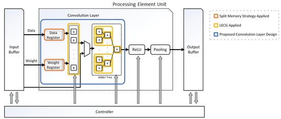 Our target was to achieve maximum power reduction by applying our proposed low-power techniques without significantly changing the conventional layer of the CNN accelerator structure. The CNN accelerator was the most frequently used part in the system for the object detection, thus consuming the most power during the detection process. In this CNN accelerator, as shown in Figure 7, we reduced power consumption by reconstructing the convolution layer part, which occupied the most part of the CNN accelerator. In Figure 7, we applied the LECG technique described in the previous section to control the multiplier and adder blocks needed for convolution, as well as to maximize the power savings by controlling the data and weight inputs through the memory split technique.
