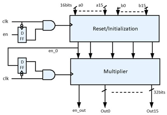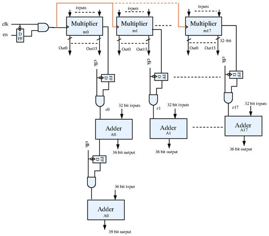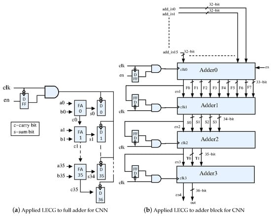 This CNN accelerator that we used as our original model utilized 32 bit adders and 36 bit adders. This design used 16 multipliers, and each had a 16 bit input and a 32 bit output. In this way, the multiplier used the 32 ×16 bit D flip flop to store the output results. We employed the clock gating to reduce the total dynamic power from these registers, as shown in Figure 8. The basic adder block also used many D flip flops, and we reduced the dynamic power by clock gating as shown in Figure 9.