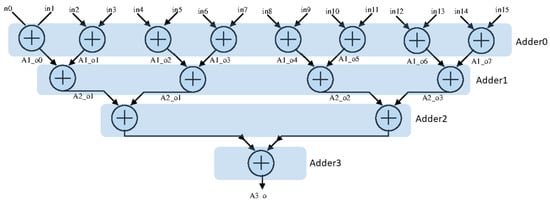 Figure 9b and Figure 10 illustrate the top adder module consisting of four adder blocks, and each adder block operated in the pipeline; hence, it could achieve the power reduction. The last adder block in the pipeline structure should be activated after the fourth clock cycle; thus, we could use the clock gating technique, and it was enabled by the previous adder block. We also used the same techniques for the other adders in the pipeline structure.
