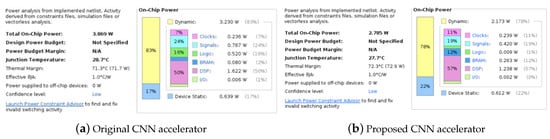 As shown in Table 1, even though the power consumption seemed to be reduced by 1 watt, the more than 30% power reduction result showed that our suggested methods could be directly effective for the FPGA implementation of the CNN accelerator.