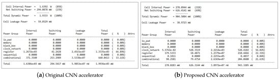 Along with the FPGA verification, we applied LECG and memory splitting techniques. In order to measure the power consumption in the ASIC design, we were not able to proceed with the physical design at this time due to the academic research lab limitations. Therefore, the multi-voltage scaling technique applied to FPGA was not applied. However, since we are currently working with the industry, we plan to proceed with the physical design with the industry in the near future. We used a 45 nm FreePDK library for the ASIC implementation and proceeded to logic synthesis through the Synopsys Design Compiler. We analyzed the power results verified through the logic synthesis, and the results are shown in Table 3. As described in Table 3 and Figure 14, we could reduce 34.9% of the power consumption in static power, and above all, we could reduce the power consumption in dynamic power by 53.21%. Overall, the total power consumption showed that our proposed CNN accelerator consumed 52.68% less power than previous approaches.