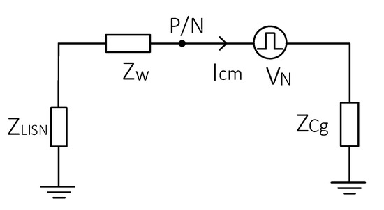 The CM noise model resulted from the developed analysis is shown in Figure 2. Here, ZLISN represents the equivalent resistance of LISN, which could be taken as a 25 Ω resistor in CM noise calculation. VN is the noise source, represents the voltage between drain and source of the switch (namely Vds). ZCg is the impedance of Cg. According to the EMI measurement specification, the length of the connecting wire between EUT and LISN should be equal to 80 cm. Here, to improve the accuracy of the noise model, the impedance of the connecting wire is considered and represented as ZW.