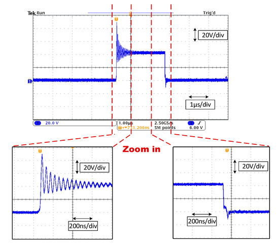 Figure 3 shows the voltage waveform of switch measured by oscilloscope. The ringing caused by turn-on and turn-off could be seen clearly from the following magnified images. Note that the turn-on ringing is quite limited and thus, its effectiveness could be ignored.