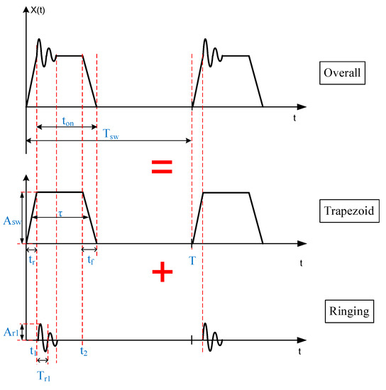 As the real voltage waveform is an irregular shape, it is difficult to calculate its spectrum directly. This paper decomposed the switch voltage waveform and the Fourier series could be done in steps. The corresponding decomposition process of the overall waveform is shown in Figure 4. The overall waveform is shown at the top of the figure, and it can be divided into the trapezoid component and the ringing component. This decomposition has reduced the complexity of Fourier transformation and improved the precision at the same time. The relative parameters are also marked in Figure 4, which could help to identify the corresponding symbols listed in Table 2.