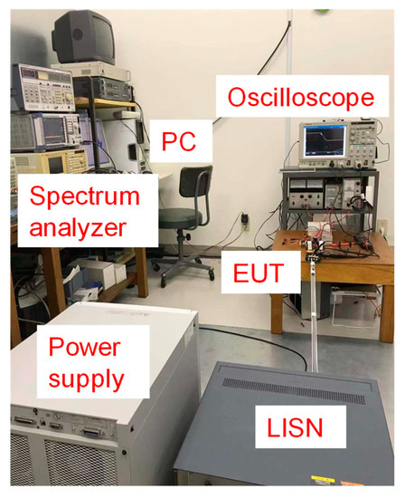 Figure 5 shows the experimental setup for capturing the voltage waveform and measuring the conducted EMI noise. The connection order is the same with configuration in Figure 1. In addition, the spectrum analyzer is connected with LISN to receive and analyze the signal, and the PC is used to display and record the spectra results. The EUT in this article is the conventional boost circuit and the different balanced boost circuits.