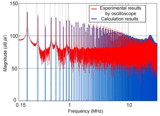 According to Equations (2)–(5) and the measured data, the Fourier series calculation was completed with Matlab 2015b. Figure 6 shows the noise source spectra comparison between experimental and calculation results. The calculation results are plotted in the blue line, and the red experimental results refer to Fast Fourier Transformation (FFT) computed by the oscilloscope. The comparison shows that the calculation results match the experimental result in all frequency ranges. The high-frequency peak is caused by the ringing, and this frequency (around 23.5 MHz) agrees with the frequency of ringing waveform in Figure 3 (Tr1 = 42.3 ns). The effectiveness of this frequency domain modeling method and the obtained parameters was well verified.