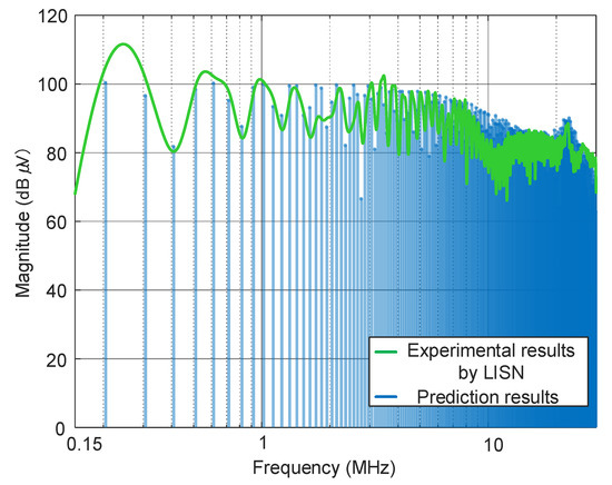 Furthermore, based on Equation (1), Figure 7 shows the prediction result of CBC by utilizing the calculated noise source. The experimental result measured by LISN is also given in green. It can be observed that the prediction result matches the measurement in the whole frequency band, and this model is able to predict CM noise with good accuracy.