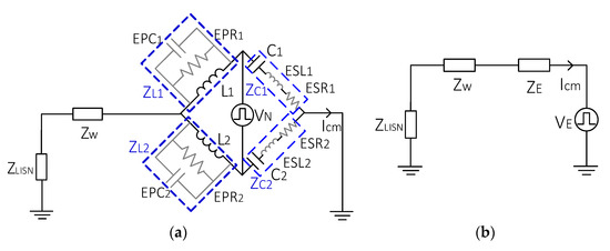 The corresponding CM noise model of balanced boost circuit is shown in Figure 9a. The model includes the equivalent parallel capacitor (EPC) and equivalent parallel resistor (EPR) of each inductor, as well asthe equivalent series inductor (ESL) and equivalent series resistor (ESR) of each capacitor. These parameters may affect the self-resonant frequency and cause impedance unbalancing as well. In addition, a more simplified model obtained according to the Thevenin theorem is shown in Figure 9b.