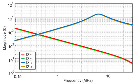 In this article, as the power inductor in the CBC is 500 μH, two 250 μH inductors (L1, L2) and two 1nF Y-capacitors (C1, C2) were utilized to build the balanced circuit. The magnitude spectra of impedance bridge arms are shown in Figure 10. The figure shows that both inductors and capacitances are well matched over the frequency range. The condition of balancing impedance is properly satisfied.
