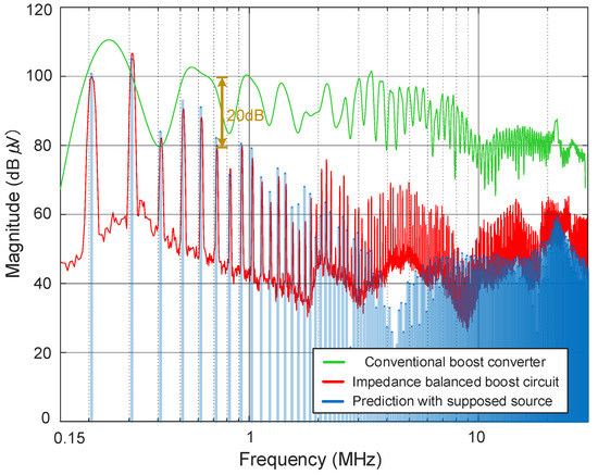 Figure 11 shows the experimental CM noise spectrum of balanced boost circuit, which is plotted in red. Meanwhile, the green envelope is the CM noise of CBC (same as in Figure 7). By utilizing the balanced technique, the noise level was well attenuated from 0.5 MHz and upwards. The effect of this technique is obvious, as much as 40 dB reduction was done at some frequency points. Nevertheless, the noise peak at low frequency bands degraded the performance. The relative analysis and solution are given in the following sections.