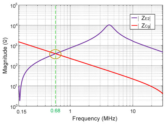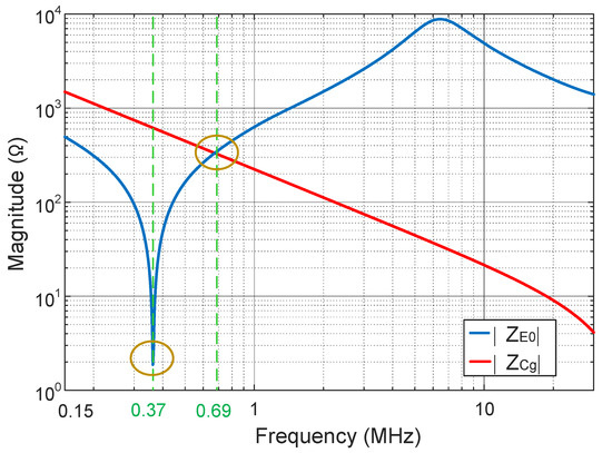 According to Figure 12, it should be noted that ZCg equals ZE0 at the point of 0.69 MHz, where the noise of balanced circuit is 80 dBμV and the CBC is about 100 dBμV. This spectra difference equals to 20 dBμV, which means that VN is about 10 times of VE according to the definition. Therefore, this paper assumed that VE is one-tenth of VN and then substituted other measured impedance values into Equations (8) for calculation.