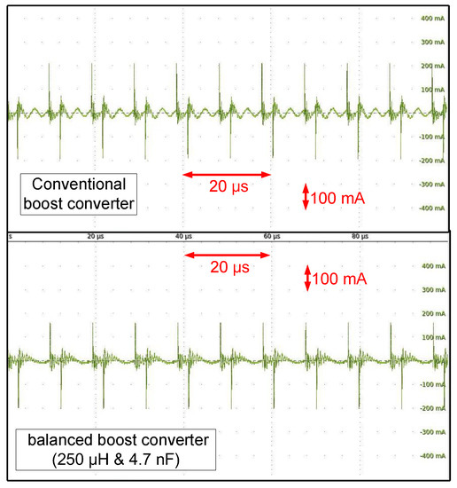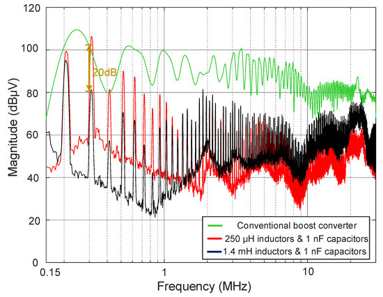 After calculation using Equations (10), the inductance should be larger than 1.3 mH if the capacitors C1 and C2 are kept constant. Here, two1.4mH inductors were utilized to replace the 250 μH inductors. The experimental results were recorded and drawn with black in Figure 13, compared with the former balanced boost circuit in red and the green envelope of CBC. These experimental results show that the proposed balanced scheme with 1.4 mH inductors and 1nF capacitors could attenuate noise level over all frequency range compared with CBC. Furthermore, the spike at 0.37 MHz was effectively suppressed. However, the noise at high frequency increased in contrast with the former balanced boost circuit (250 μH and 1 nF). The valley at 0.8 MHz is due to the self-resonance between the 1.4 mH inductor and its EPCs.