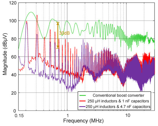 The CM noise spectra comparison is shown in Figure 15. The purple curve is for the case of an optimized solution after replacing the 1 nF Y-capacitors with 4.7 nF, the green one is the noise envelope of CBC, and the red one is for the former balanced circuit boost (250 μH and 1 nF). The comparison shows that after utilizing the scheme with 4.7 nF capacitors, a low-frequency spike was also moved out from the frequency band of interest and the CM noise was significantly attenuated. Meanwhile, at a high frequency, the noise after adopting 4.7 nF capacitors is lower than the former case using 1 nF capacitors.