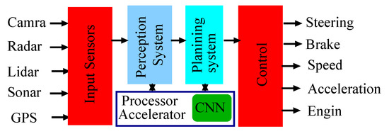Machine and deep learning techniques have been the main driving force of the autonomous vehicles industry in recent years [1,2]. Using robots driven by those techniques has dramatically boosted up the productivity and reduced the cost of those industries [3]. Limited hardware and software resources have constrained the efficiency and performance of deep learning architecture design. Therefore, improving the capabilities of hardware components such as high-speed processors and large space memories is needed to provide more opportunities for high performance deep learning architectures [3]. Autonomous driving systems usually include many interconnected hardware components such as sensors, computer vision, and planning and control subsystems, as shown in Figure 1 [3]. These systems are primarily controlled by deep learning algorithms for object detection and classification, lane detection, and instant and semantic segmentation. A convolution neural network (CNN) is the main data-processing unit in deep learning architectures. CNNs are used to automatically learn object features through implementing convolution operation across deep layers of the network using shared weights that are automatically learned by the network [4,5].