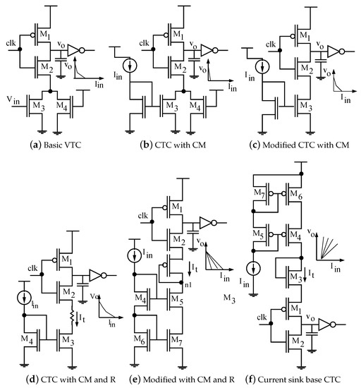 Figure 3 shows different CTC and VTC circuits and their transfer characteristics. The circuit in Figure 3a is the basic structure of a VTC, which is based on a voltage-controlled delay unit (VCDU). At the falling edge of the controlling clock (), the node capacitor () gets charged by . The charging time of () can be controlled by the conductance of the PMOS (M1). During the rising edge of the clock (), the node capacitor discharges through the transistors M2, M3, and M4. Since controls the conductivity of the M3 transistor, it is used to control the discharge current of the node capacitor. Therefore, the rising time of the output voltage is controlled by . Ideally, the rising time of the output voltage should linearly change with an input voltage of . However, the transfer characteristics of the MOSFET are nonlinear following the square law. Therefore, developing the desired linear relationship cannot be possibly achieved using the circuit configuration in Figure 3a. Figure 3b shows a circuit configuration that provides a possible way to achieve such a linear relationship. In this configuration, a current mirror (CM) made up of two transistors is used to replace the M3 transistor in Figure 3a. This makes the current flowing in M3 of Figure 3b the same as the input mirror current (). Due to the high impedance of the current mirror, the largest portion of the total current will flow through the M4 transistor and hence a very small conversion gain will be provided. Therefore, an improved design is shown in Figure 3c, which is further modified in Figure 3d. An additional resistance R has been used to generate a linear current source, which is necessary to maintain the M3 transistor in the saturation region. This will emphasize the linearity of the output delay. However, including such a resistance requires a challenging fabrication process. Therefore, the resistor has been replaced by a diode-connected active current source as shown in Figure 3e. The circuit configuration in Figure 3e also includes a cascaded current mirror that is needed to achieve maximum conversion gain. A PMOS-based circuit also can be designed using the same technique as shown in Figure 3f.