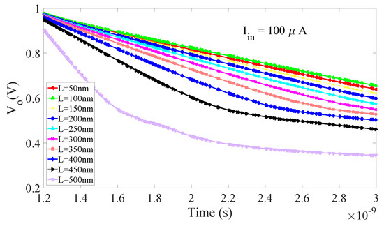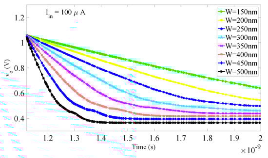The linear relationship between input current () and output voltage () very much depends on the resistance value of the diode-connected M3 transistor, which is shown in Figure 6 (this is a simulation result). M3 is working as a biasing current source for the cascaded current source, which is the next unit for the proposed CTC. In Figure 6, curves become straighter with the increase in device length because MOSFET resistance increases with the increment in channel length. In Figure 6, the high value of resistance of the M3 transistor helps to increase linearity because the long channel device limits the second-order and nonlinear effects such as short channel, subthreshold, channel length modulation, and gate-induced drain leakage (GIDL). Linearity is also dependent on the width of the M3 transistor, because it is inversely proportional to resistance, which is shown in Figure 7. A wide width transistor also reduces the nonlinearity in the drain current due to the short channel effect. In Figure 3e, as per the working principle, the current mirror copies the input current on the output node (n1). Further, the cascaded current mirror reduces the channel length modulation and increases output resistance. It also reduces the errors in output currents because of the internal property of the current mirror. The discussed modification in the proposed CTC makes it more efficient than the state-of-the-art designs. The simulation results of the proposed CTC are shown in Figure 8. Simulation results show the linear change in the node voltage for different input currents. The step size in the output is almost symmetric with the symmetric change in the input current, because the strong M3 transistor biases the cascaded current mirror and the cascaded state also provides extra linearity. The proposed work is part of the ADC and the conversion gain is the main parameter for us. We tried to increase the conversion gain. The detailed comparison of the conversion gain with the state-of-the-art experimental result is shown in Table 1 [15,22]. The characteristics of the proposed CTC are shown in Figure 5. The conversion gain of the proposed CTC is 3.86 ms/A, which is 52 times larger than the state-of-the-art design [15]. The robustness of the proposed design is discussed in the following section.