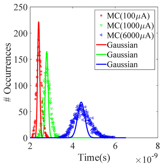 We have used the current mirror circuit in order to design the CTC, which is sensitive towards the MOSFET device parametric variation due to the process, temperature, and supply voltage variations. We used only four transistors for the current mirror circuit, which is not a large area penalty, and hence we can increase the sizing of this transistor. To check the robustness of the proposed CTC circuit, we analyzed the effects of nonidealities on the output delay. We have considered nonidealities in the W, L, and threshold voltage variation of the MOSFET. We have assumed a 10% global variation in the threshold voltage. We have used 5000 Monte Carlo (MC) simulations at a six sigma deviation for the process variation analysis. Figure 9 shows the simulation results for A, A, and A input currents. The results show very little deviation () from the mean value, which means that the design is stable and robust. We have chosen these values because the built-in computational random access (C-RAM) with 64 columns and all store data in high logic produces a maximum A current. Hence, ADC can be used in built-in C-RAM designed using the proposed CTC. C-RAM is the important block of the CNN accelerators that is used in an autonomous vehicle.
