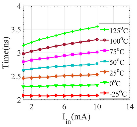 Output delay with temperature variation is shown in Figure 10. The simulation results show the sensitivity with temperature variation. Results show that the CTC is very much sensitive to temperature variation. Hence, the specifications, i.e., the initial conditions of the CTC, will change with temperature. However, it is showing a linear shift in delay with temperature; thus, it can be repaired. Further, Figure 11 shows the change in output delay with a 10% variation in supply voltage, and results show a minimal difference. Hence the circuit can tolerate the supply voltage variations.