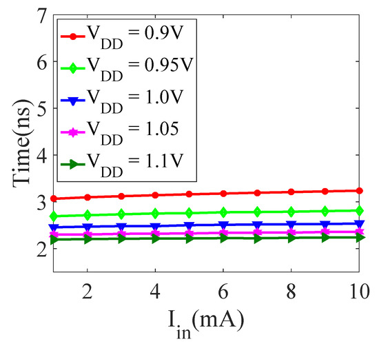 In the last few decades, there has been tremendous progress in CMOS processes, which caused large reductions in device dimensions. This has dramatically affected the operating voltage ranges of ADC converters, which must be accounted for in the design [14]. Therefore, traditional ADC converters have been affected by many challenging factors in terms of stability and reliability. Several types of voltage-to-time (VTC) and current-to-time (CTC) converters have been proposed for high-speed applications. However, they have very low conversion gains and consume more area and power [15,16]. All of the VTC and CTC designs that have been proposed in recent studies are based on the principle of using the input current or voltage to amplify the output delay. In our proposed VTC design, the input current is converted into the corresponding discharge current. Developing a linear relationship between the output voltage and the input current/voltage is another crucial challenge in VTC/CTC design [15,17,18]. This linear relationship is necessary to produce a linear output delay. Producing a significant amplification in the output delay with a small change in input current/voltage is another issue that should be considered. Some modern VTC designs involved using a reference voltage, which is compared with the decision on this voltage and the output delay [15,17,19]. In addition, these designs require the capacitor to be completely discharged before the next input sample, which is difficult in actual situations. Moreover, including this capacitor results in an increased chip design area. Zhang et al. [18] used a current-starved inverter approach to design a VTC converter. However, this method has a very low initial delay and a poor conversion gain. A pre-skewed bi-directional gated delay line has been also proposed in [16] to design a sigma delta-based time-to-digital converter.