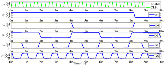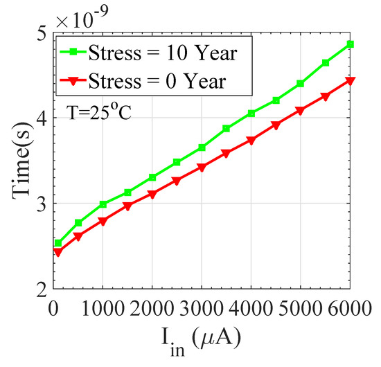 where is the technology-dependent parameter and it is equal to the . The is a prefactor, and the value of the prefactor depends on the operating frequency and the gate input probability (). Moreover, it is reported that the lifetime is four times larger in AC than in DC stress. In the state-of-the-art design, charging and discharging of the output capacitors is done by PMOS [15]. From the literature, NBTI is the major reliability source that increases the threshold voltage of the PMOS transistors. Hence, we can conclude that state-of-the-art designs are not reliable. The simulation results for reliability due to NBTI and hot carrier injection (HCI) are compared in Figure 12. The figure compares the voltage-to-time characteristics for ten-year DC stress. The proposed circuit shows a maximum 8.6% shift in results for ten-year stress, which is much smaller than the most advanced available state-of-the-art designs [15].