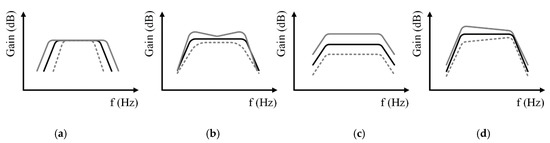 Nevertheless, most previous complex BPFs [2,4,5,6,7,8,9] have not allowed the tuning of passband gain flatness (illustrated in Figure 1d), which is an important performance parameter in the analog baseband filter. A flat gain profile in the passband is essential to minimizing the amplitude distortion of the processed signal. It is interesting to note that Wu and Chiu [10] reported an active-resistance-capacitance (active-RC) real-domain BPF—although it was not a complex BPF—with measurement results for the in-band flatness deviation, but never implemented its tunability. Lee et al. [11] and Gomez-Garcia et al. [12] proposed a design method to improve the passband flatness, but it was limited only to passive-type real-domain BPFs.