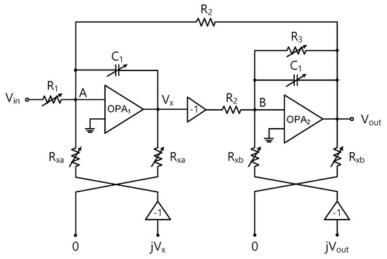 Figure 2 shows the circuit diagram of the proposed biquad-based complex BPF, which exhibits second-order complex bandpass filtering characteristics. As shown in the figure, the complex BPF comprises two biquads in the I and Q paths that are cross-connected by two cross-coupling resistors Rxa and Rxb. The biquad is based on a two-integrator-loop Tow-Thomas structure, which is widely adopted for baseband LPF designs [14,15]. The biquad in Figure 2 is known as an inverted Tow-Thomas structure since its lossless integrator part is placed before the lossy integrator part [16].