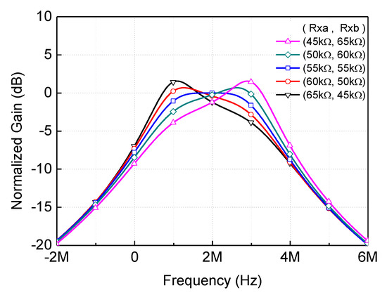 The passband flatness tunability via Rxa and Rxb is verified by the numerical computation of the transfer function given in Equation (5). Figure 6 shows the computed gain characteristic curves with Rxa and Rxb set in the range of 45–65 kΩ and R1 = 50 kΩ, R2 = 82 kΩ, R3 = 58 kΩ, and C1 = 1.5 pF. As can be seen, when Rxb is greater than Rxa, the passband gain profile becomes slanted up toward the high frequency region, as also indicated by Figure 5b. Further, when Rxa is greater than Rxb, the passband gain profile becomes slanted down toward the high frequency region, as also indicated by Figure 5c. When Rxa and Rxb are both set to 55 kΩ, the passband gain profile shows very flat characteristics. However, as discussed above, such a perfect flat condition would never occur after practical CMOS implementations due to the process variability and non-uniformity. Thus, the independent tuning scheme of Rxa and Rxb should be very effective to improving the passband gain profile flatness.