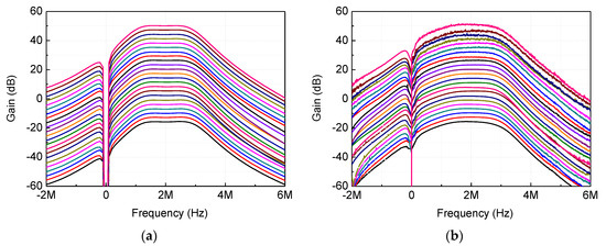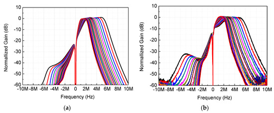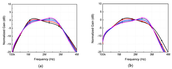 Figure 13a,b shows the passband gain flatness tuning results obtained by simulations and measurements, respectively, with the results in excellent agreement. The bandwidth and center frequency were set to the nominal value of 2 MHz. Five gain profile curves are shown in the figure with Rxb tuned in five steps of 40, 43, 48, 52, and 55 kΩ, and Rxa fixed to 52 kΩ. It should be pointed out that the actual tuning resolutions of Rxa and Rxb were designed as 3- and 4-bit, respectively, so that much finer tuning than Figure 13 was possible when needed in practice. It can be observed that the gain difference at the low- and high-end cutoff frequencies could be tuned from −1.0 to +1.0 dB. In addition, as verified by the analytic and computational results in Section 2, we found that as Rxb increased, the passband gain profile gradually changed from being slanted downward to upward. These results imply that when the passband gain flatness is not satisfactory after CMOS implementation because of possible process variability and non-uniformity, the passband gain profile can be finely adjusted for maximal flatness by on-chip tuning.