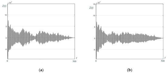 In the previous sections, we described different schemes for mixing a useful signal with a chaotic one. In particular, the works of Short [22] indicated in Section 2 show the vulnerability of systems with additive parametric modulation. In his works, it was shown that it is possible to create a filter that selects a useful (i.e., deterministic) signal from a chaotic carrier. In this regard, the security analysis of systems in Section 3.2 with multiplicative parametric modulation is valid. It is obvious that nonlinear mixing and the system (1) global reconstruction into Equations (3) and (4) will provide a more complex waveform for Z(t), but it is necessary to prove this mathematically. For this purpose, we applied the signal Z(t) to the communication channel with a multiplicatively mixed some useful periodic signal (hereinafter, a useful signal transmission) and without a mixed useful signal (hereinafter, an idle transmission). To analyze these transmissions, we used the standard signal processing functions from the MATLAB: autocorrelation and Fourier transform.