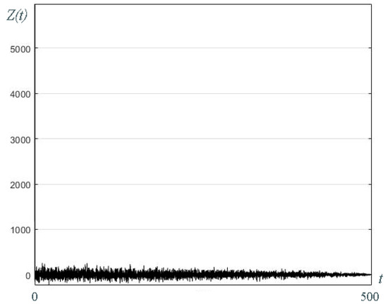 Figure 7a,b shows that the shape of the correlograms did not indicate the presence of a useful signal in a chaotic carrier. Moreover, the shape of the correlogram of a completely random signal (Figure 8) also did not differ from the correlograms of deterministic chaos. Thus, analysis using correlograms confirmed the possibility of using this method to protect data transmission. Moreover, this ensured the steganography of the system, i.e., concealment from an external listener of the very fact that we were transmitting a useful signal.