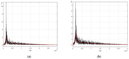 Fourier series plots for Z(t). Black line: Fourier series; red lines: Savitzky-Golay filter; (a) idle transmission; and (b) transmission with useful signal.