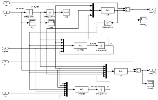 So, the transmitter MATLAB/Simulink model structure according to model (3) had the form as in Figure 3. In Figure 3 the block dz/dt consists function (4), and inputs a(t) and c(t) were modulated with useful signals according to (5).