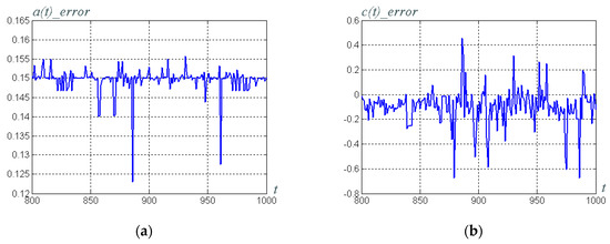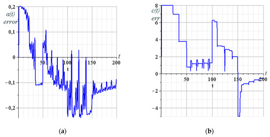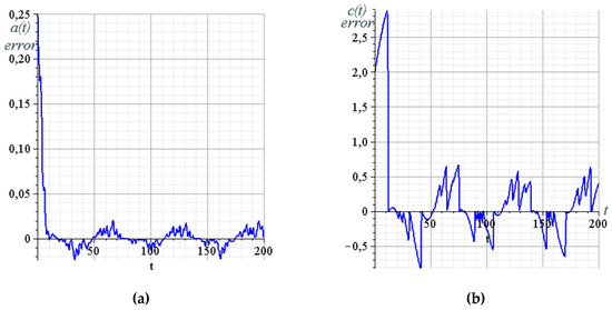 The simulation results show a low efficiency of this estimation method for reconstructing a signal with a chaotic carrier. In particular, in Figure 18 and Figure 19, an unacceptably high recovery error was observed for parameter a. In general, based on the results of a qualitative comparison of Figure 13, Figure 15 with Figure 18, we can outline the advantages of a synergetic nonlinear observer. In addition, in further modeling of the system of Equation (1) and Equations (24), (27), (28), the least squares method was inoperative due to the accumulation of estimation errors.