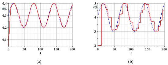 Useful signal reconstruction with a two channel LS method observer: (a) Useful signal a (blue is the initial signal at the transmitter side; and red is the reconstructed signal at the receiver side); (b) Useful signal c (blue is the initial signal at the transmitter side; and red is the reconstructed signal at the receiver side).