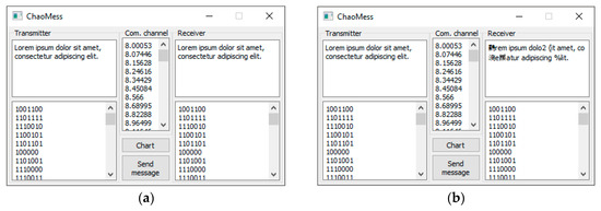 In order to validate the system for transmission of useful digital data, our team with the help of Alexander D. Zolkin converted the MATLAB/Simulink system diagrams into C++ code and used it to create the virtual test bed providing transmission of a test phrase. The main window of the testbed is presented at Figure 20a,b. The test phrase is “Lorem ipsum dolor sit amet, consectetur adipiscing elit”. As expected, the error of signal reconstruction in the proposed algorithm did not allow it to be used to transfer useful digital data without additional processing. As we needed only to validate the data transmission system, we only used multiple transmission as the simplest method of eliminating transmission errors. Figure 20a shows the result of the transmission with a number of retransmissions of 20,000.