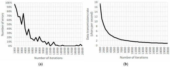 A smaller number of transmissions, for example, 8000, resulted in the persistence of transmission errors (Figure 20b). We also evaluated the necessary number of repetitions to provide the desired error rate in transmission. However, this issue requires future study. The same procedure may be used for two-channel communication system validation.