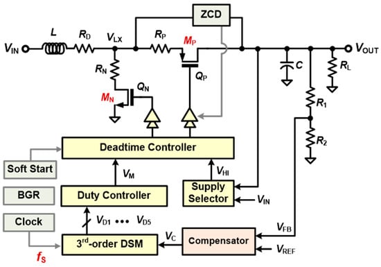 The block diagram of the proposed boost converter is shown in Figure 1. The converter is composed of power stages (two switches of MN and MP, an external inductor L, and an output capacitor C), feedback networks (a resistor divider comprising R1 and R2 and a compensator), and control blocks (a third-order DSM, a duty controller, and a dead-time controller). The external inductor and capacitor are 2.8 μH and 20 μF, respectively. The signal difference between the scaled output voltage VFB and reference voltage VREF is processed by the compensator and fed to the DSM input. The switching noise of the converter can be reduced by the noise shaping capability of the DSM. The DSM outputs noise-shaped, digitized single-bit, and multiple delayed signals of VD1 to VD5 to control the on-time duty ratio. The duty controller produces a modified output bitstream VM with this limited on-time duty ratio. VM drives the power stage through a deadtime controller. The clock signal fS is applied externally with a 12 MHz source. The converter has a single operating mode because it operates only in the continuous conduction mode (CCM) condition under the targeted output load of 50–450 mA. A zero-current detector (ZCD) was included for stable operation under light load conditions below 50 mA. A bandgap reference (BGR), soft start, and supply selector were also designed for a more robust operation.