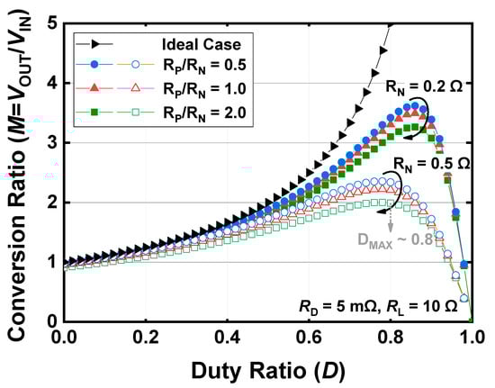 The reduction in M is demonstrated for various on-resistances of transistors in Figure 2. As shown in Figure 2, the parasitic resistance and on-resistances in Equation (1) limit the maximum M and determine the upper limit of D (DMAX) that can produce normal operation with a positive gain. It is noteworthy that although M is not a function of VIN, RN and RP are proportional to VIN; therefore, the maximum output voltage can vary with VIN. In the targeted system, the worst-case DMAX at which M begins to decrease is about 0.8, which occurs at the maximum load current and highest RN condition. The duty cycle of the DSM controller should be clamped to a fixed DMAX to prevent control loop instability.