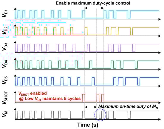 The proposed duty cycle limiter (DCL) is shown in Figure 3. Multiple delayed signals (VD1 to VD5) connected to the DSM output (DSMO) and a modified counter with an AND gate are used to clamp the duty cycle of the controller. By connecting the inverting output of the D-type flip-flop (DFF) back to the “D” input through the AND gate and creating a feedback loop, the signal period applied to VSUM can be counted using the clock signal fS. VSUM outputs high only when VD1 to VD5 produce low simultaneously. Therefore, if the DSM outputs a low signal for five or more periods, VSUM activates the DFF to form a new pulse VSHOT. This signal is combined with the original DSM output VD1 and limits the on-time duty of the proposed boost converter. Figure 4 shows the simulation results of the proposed duty cycle control. VSHOT is generated when the output of the DSM maintains low for more than five cycles, as explained earlier. The modified control signal of the controller VM effectively limits the DMAX of the converter by adding new pulses through VSHOT. The clamped DMAX is approximately 83%, which corresponds to the system simulation results.