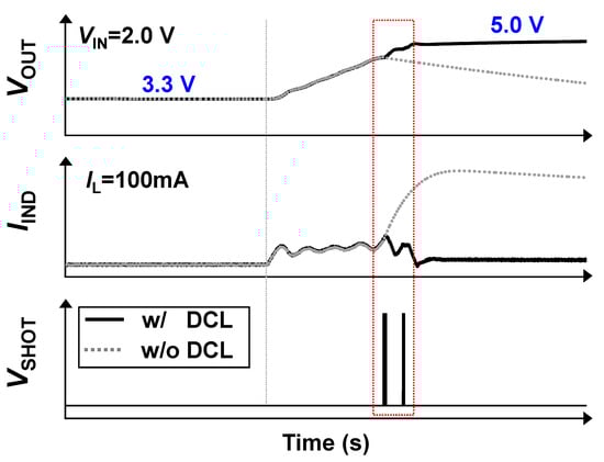 The simulation result of the dynamic output voltage scaling according to the DCL scheme is shown in Figure 5. Without the DCL, because a VSHOT signal is not produced and a 100% duty condition in which MN is solely turned on has occurred, the stored energy of the inductor causes an excessive current; hence, the output voltage decreases below the targeted value and the feedback loop becomes unstable. Meanwhile, with the DCL, DMAX is limited by VSHOT, resulting in stable operation of the converter. The stability of the control loop is maintained despite the forced VM because the compensator and DSM can sufficiently cope with the variation in the output voltage from the changed switching operation. Therefore, the proposed step-up converter enables a wide range of scalable output voltages with stable transient responses, as shown in Figure 5. Moreover, because the proposed technique controls the duty cycle in the digital domain rather than in the analog domain, it is more immune to process and temperature variations [].