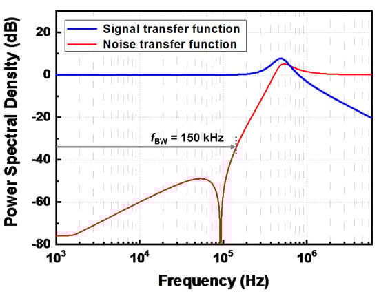 where RX = R2‖R4‖R6, RY = R3‖R5‖R7, and C = C1= 2∙C2= C3. The positive feedback produced by R5 makes a resonating condition when R4 =3∙R5. The resonating condition is used to implement a zero-optimized noise transfer function (NTF). The DSM can maximize the signal-to-noise ratio by optimizing the NTF zeros. The simulation results of the signal transfer function and NTF of the DSM are illustrated in Figure 7 using a Matlab/Simulink simulation platform. This noise shaping characteristic of the DSM controller can effectively suppress the switching noise of the boost converter. The corresponding sampling frequency (fS) and signal bandwidth (fBW) are 12 MHz and 150 kHz, respectively. The performance of the DSM was described in greater detail in []. The primary difference of the DSM compared with [] is that it adopts only the third-order loop filter structure. This is because the proposed converter has a small output load range and operates only in the CCM. Thus, the converter does not suffer from instability of the mode switching and alleviates the design complexity of the compensator. Moreover, the third-order structure exhibits a signal-to-noise ratio more than 20 dB higher when compared with its second-order counterpart [], which can improve the switching noise rejection.