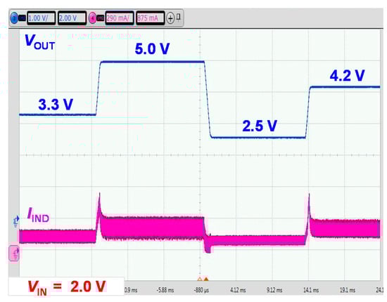 The proposed step-up converter can adjust the output voltage dynamically by changing the reference voltage, as shown in Figure 10. For a VIN of 2.0 V and IL of 125 mA, VOUT changes from 2.5 to 5.0 V. A wide-range scalable output voltage was produced by virtue of the maximum duty cycle limiter, which enables stable and robust operation of the converter.