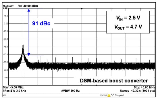 Figure 11 shows the measured output spectrum of the proposed DSM-based step-up converter. The spurious tones were suppressed effectively, as predicted. A first spurious peak located at −91 dBc below the DC signal was achieved. Although the rejection of the switching noise was not as good as that for the buck converter [], the proposed converter demonstrated significantly reduced switching harmonics compared with a conventional PWM-based boost converter [] and DSM-based boost converters [,].
