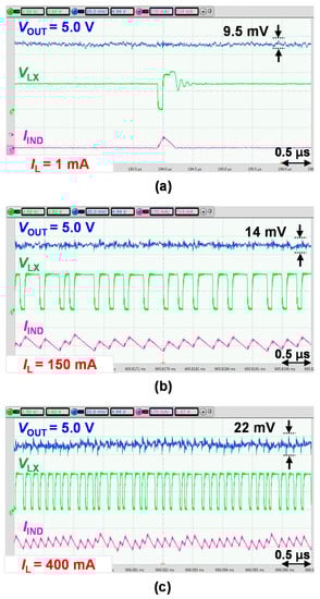 Figure 12 shows the transient waveforms with respect to the load current at VIN = 3.7 V and VOUT = 5.0 V. When IL= 1 mA, the reverse inductor current is controlled effectively by the ZCD. As the load current increases, the output voltage ripple worsens; however, it is controlled within 25 mV at a 450 mA load. Moreover, the body diode did not conduct, owing to the deadtime controller in the CCM operation where the ZCD was not enabled (Figure 12b,c).