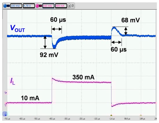 Figure 13 shows the load transient response with VIN = 3.7 V when IL changes between 10 and 350 mA. The transient recovery times and undershoot voltages were less than 60 μs and 92 mV, respectively. These measurements indicate that the proposed step-up converter produces a good transient response with robust stability.