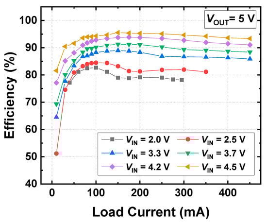 Figure 14 shows the measured efficiency with different input voltages at VOUT = 5 V. The converter exhibited a peak efficiency of 95.5% when VIN = 4.5 V and IL = 150 mA. For the targeted load current range from 50 to 450 mA, the converter efficiency was maintained over 80% regardless of the input voltage. Table 1 summarizes the performance of the boost converter and compares it with that of the state-of-the-art boost converters.
