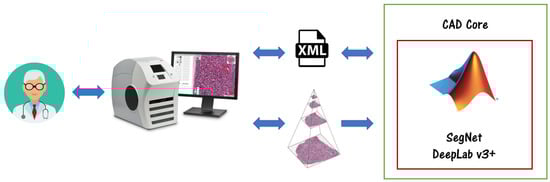 CAD architecture. Physicians can visualize and annotate the WSIs using Aperio ImageScope software. The developed Deep Learning models can interact with ImageScope through an XML interface.